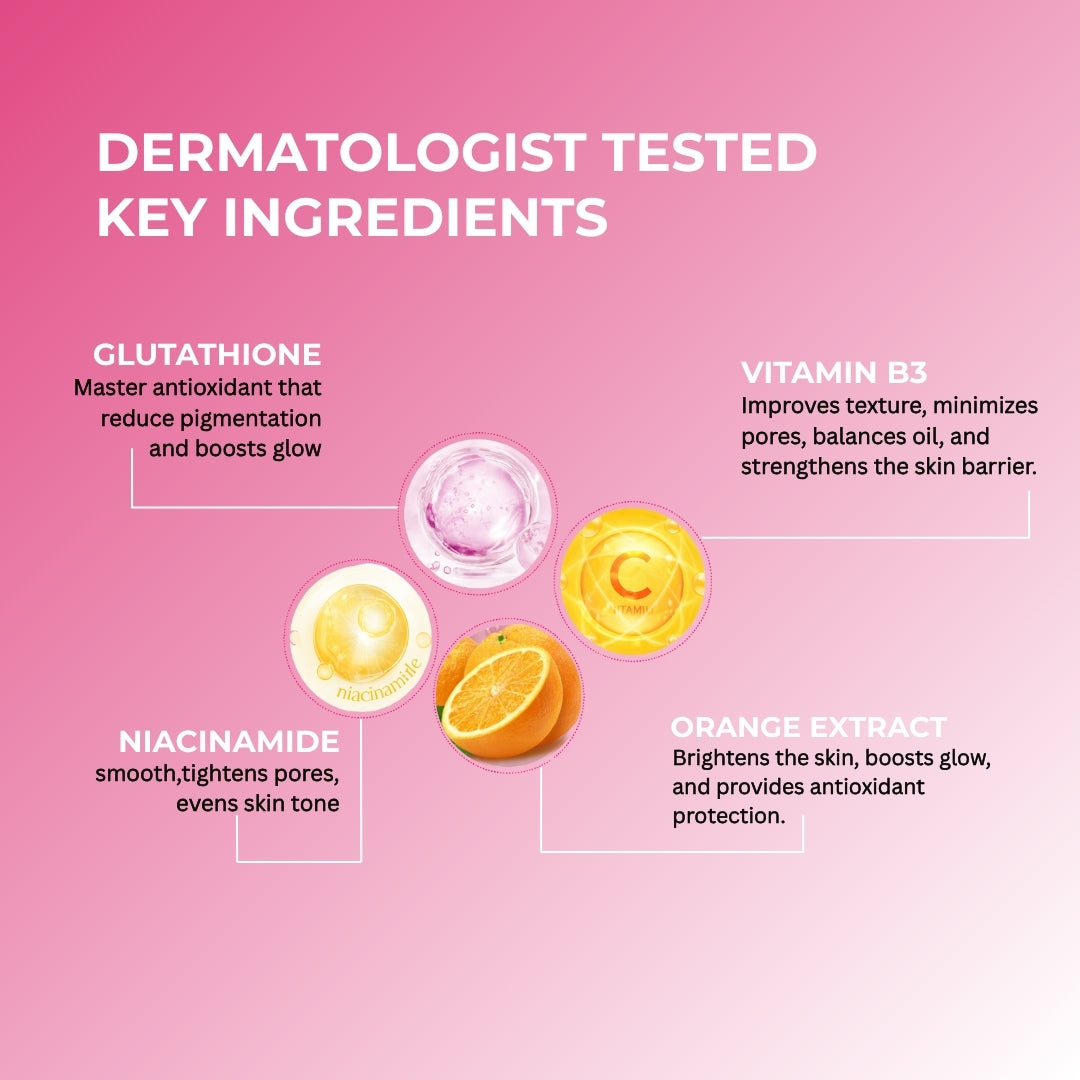 Bring out your skin’s natural glow with this powerful blend of 2% Glutathione and 2% Vitamin B3, enriched with the goodness of Watermelon and Pomegranate extracts. This lightweight serum works deep within to brighten dull skin, even out tone, and restore hydration, while helping to reduce the first signs of aging. A simple, effective step to reveal smoother, fresher, and more radiant skin—every single day.